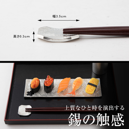 《100年以上の老舗店・薩摩錫器工芸館》 錫の箸置き2個セットです。 錫は錆びない・割れない、縁起の良い金属として知られています。職人さんが手作りにて製作しております。 ご自宅の食卓でのご使用はもちろん、プレゼントなどの贈り物にもおすすめです。 薩摩錫器工芸館 株式会社 0995-45-0177 https://www.satsumasuzuki.co.jp/ 《地産理由》市内で製造・加工された工芸品