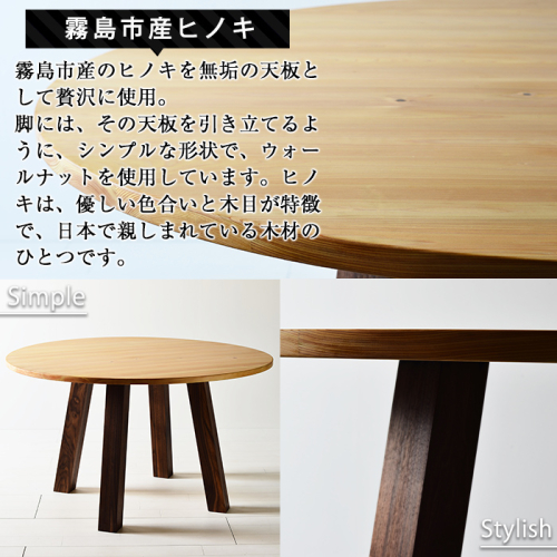霧島市産のヒノキを無垢の天板として使った贅沢な丸テーブルです。