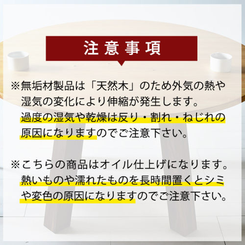 ※無垢材製品は「天然木」のため外気の熱や湿気の変化により伸縮が発生します。 過度の湿気や乾燥は反り・割れ・ねじれの原因になりますのでご注意下さい。