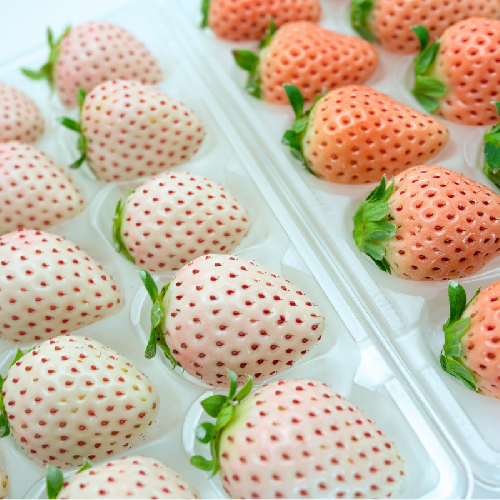 一般的な赤いいちごに比べて酸味が少なくほのかに香る甘い匂い、甘く上品な後味、果肉も白く粒だけが赤いのも特徴です。