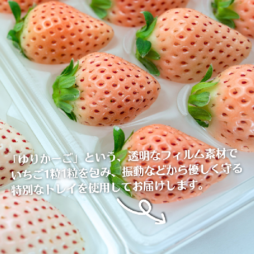透明なフィルム素材のもので、いちご1粒1粒を包み、振動などから優しく守る特別なトレイを使用してお届けします。
