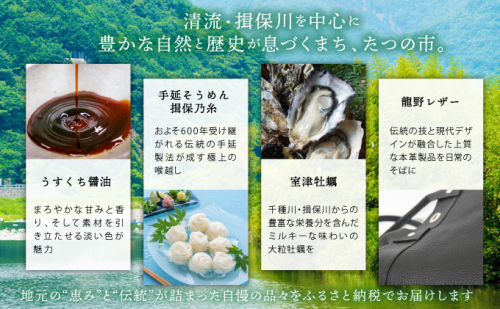たつの市は、「そ~めんやっぱり揖保乃糸~」の産地、うすくち醤油生産量日本一、皮革生産高日本一を誇る多様な地場産業と、武家屋敷や白壁の土蔵など、城下町の面影が今も残り、歴史的風情と昭和レトロな雰囲気から、「播磨の小京都」と呼ばれています。また、海岸線まで山々がせまり、「揖保川」と「千種川」という2つの大きな川が流れ込み、森からの自然の栄養素が豊富に集まる播磨灘が育んだ牡蠣は、とにかく身入りがよく、味はクリーミーで濃厚、加熱しても縮みにくく、全国でも有数の産地となっています。