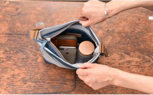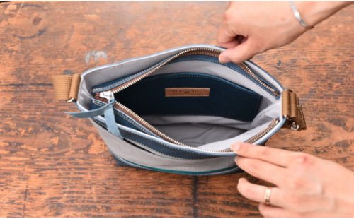 上ファスナー部分、内ポケット、底の部分にブルーの近江牛を使用。ショルダーベルトには肩への負担が少なく長時間かけていても疲れにくい様、コットンベルトで製作しているのが特徴です。近江牛レザーの風合いと使い心地を楽しめるショルダーバッグです。
