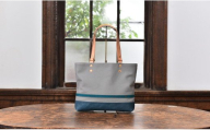 上部の革、底のブルーの革、内ポケットの革は、近江牛レザーとなっております。グリーンのラインのみ国内産の革を使用しております。表生地のグレーの帆布は高島帆布を使用しております。