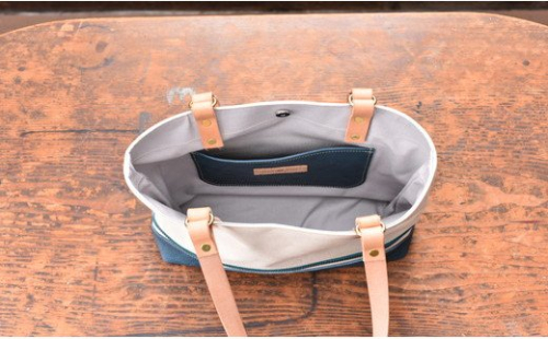 底のブルーの革、内ポケットの革は、近江牛レザーとなっております。グリーンのラインのみ国内産の革を使用しております。表生地のグレーの帆布は高島帆布を使用しております。