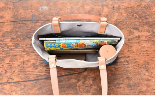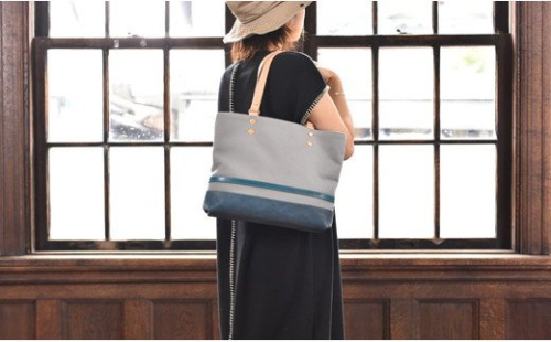 岡喜近江牛レザーと帆布のトートバッグ グレー/琵琶湖ブルー【Mサイズ】【CC20W】