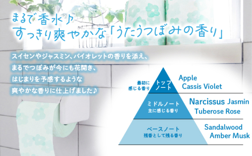 淡いグリーン色のロールに、ほんのりと色付くグリーンのhanauta柄をプリント。スイセンとジャスミンを中心とした香りで、爽やかなバイオレットリーフ(スミレ)とアップル、深みのあるムスクの香りをプラス。つぼみから今にもパッと花が開き、はじまりを予感するようなすっきりとした甘い香りが上品なトイレ空間を演出します。