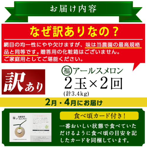 【0421109b】<訳あり!定期便・全2回(2月・4月)>マル福の高級アールスメロン(2玉×2回・計6.8kg)メロン フルーツ 果物 果実 6キロ 数量限定 期間限定【マル福園芸組合】