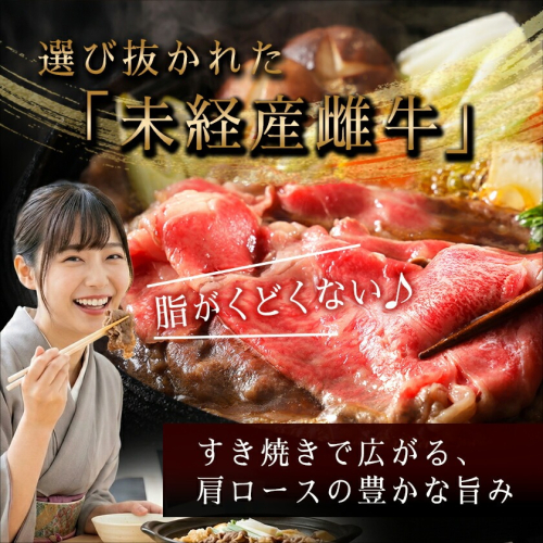 【霧島和牛】未経産雌牛使用! 霧島和牛未経産雌牛は、月齢30ヵ月齢前後までストレスフリーな環境で、独自のオリジナル飼料で育った、きめ細かなサシとくどくない脂質が自慢の黒毛和牛です。 肩ロースは、赤身肉のなかでも比較的脂肪が多めで、食感はやわらくお肉の風味も濃厚なのが特徴です! 是非、すき焼きやしゃぶしゃぶでお召し上がりください♪ ※牛肉の鮮度を保つためにスライスを一枚ずつシートで包んでおります。 ※冷凍配送のため、肉色が濃くなりますが、品質、味ともに問題ございません。安心してお召し上がり下さい。 ≪解凍方法≫ ・調理される前日に冷蔵庫に移して、ゆっくりと解凍してください。 ・解凍の際、若干量のドリップ(水分等の流出)が発生する場合がございますが、品質には問題ございません。 【提供事業者】KIRISHIMA RANCH 株式会社