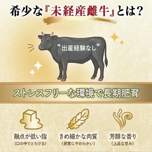 霧島和牛未経産雌牛は、月齢30ヵ月齢前後までストレスフリーな環境で、独自のオリジナル飼料で育った、きめ細かなサシとくどくない脂質が自慢の黒毛和牛です。