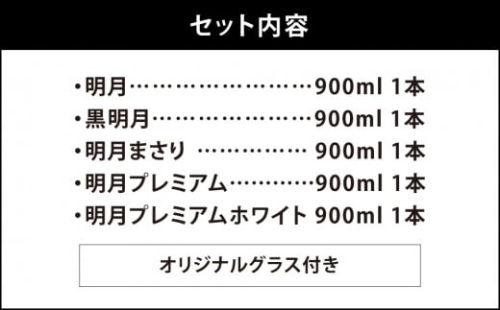 明石酒造の人気銘柄「明月」「黒明月」「明月まさり」「明月プレミアム」「明月プレミアムホワイト」の5本をセットにしました。