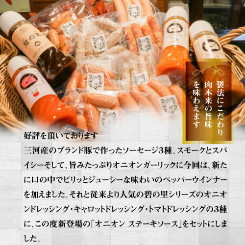 厳選三河豚で作った好評を頂いておりますソーセージ3種、スモークとスパイシーそして、旨みたっぷりオニオンガーリックに今回は、新たに口の中でピリッとジューシーな味わいのペッパーウインナーを加えました。それと従来より人気の碧の里シリーズのオニオンドレッシング・キャロットドレッシング・トマトドレッシングの3種と、この度新登場の「オニオン ステーキソース」をトッピングした、期待を裏切らないセットです。