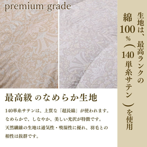 側生地は綿100%(140単糸サテン)で、軽くなめらかで肌触りが抜群です。天然繊維の生地は通気性・吸湿性に優れ、羽毛との相性が抜群。