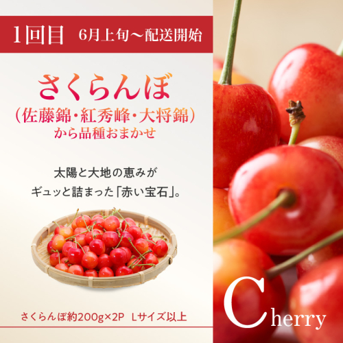 - 【定期便1回目】:さくらんぼ(佐藤錦・紅秀峰・大将錦からおまかせ)L以上 約200g×2P