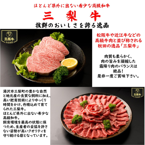 最高品質の三梨牛を食べやすいサイズにカットし、焼肉でも、すき焼きでも満足のいくボリュームです。 【地場産品基準】 第1号:区域内で生産されたものであるため。
