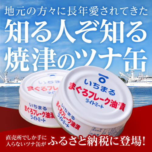 【説明】地元の方々や多くの船員に長年愛されてきた、自社直売所のみでしか販売されていない知る人ぞ知るツナ缶です。当社は昭和28年より缶詰製造に携わって参りました。「いちまるのライトミート」は当初、焼津港に入港いただいた船員やその関係者の皆様への贈り物、従業員専用の商品として製造していたものですが、食べた方々から親しいご親戚・近所のご友人に贈られ口コミが広がったことで、現在は直売所でのみ販売を続けております。現在ではその想いを引き継いで信頼のできる焼津市内の老舗パートナー企業に製造をお願いしております。原材料はキハダマグロを使用しておりさっぱりとした味と、身のやわらかさが特徴です。隠し味に野菜スープを使用しており、ほんのりと味が付いているためそのままサラダなどにかけてお召し上がり頂けます。内容量も80g/缶とずっしりで製造は安心安全の国産です。(焼津市内で製造)賞味期限も製造日から3年なので、普段使いから備蓄用にまで対応できます。