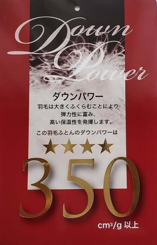 羽毛にふとんの中と同程度の圧力をかけたときの羽毛1gあたりの体積がダウンパワー(cm3/g)の数値です。
