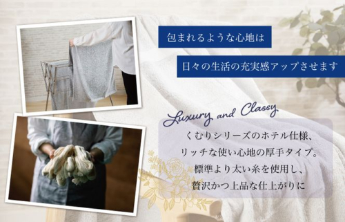 くむりシリーズのホテル仕様、リッチな使い心地の厚手タイプ 標準より太い糸を使用し、贅沢かつ上品な仕上がりに。洗うほどにコットンの良さを感じさせ、包まれるような心地は日々の生活の充実感をアップさせます。 ■オフセットヤーンは実用新案第3153942号を取得。タオル製品において独占契約をしていますので、当社だけでしか味わえない使い心地です。 ■製造時、糸に強度を付けるために使う糊は安全な食用糊を使用しているので仕上がりまでにはきれいに残らず洗い流されます。 ■製造時、仕上げの柔軟剤は使用していません。 ・泉州こだわりタオル認定製品 ・経済産業省 地域産業資源活用事業製品 ・2017 OMOTENASHI SELECTION受賞 原材料:綿100%、泉佐野市