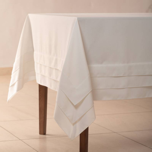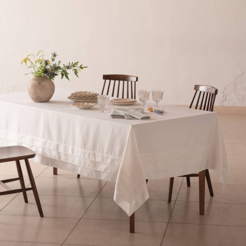 一見シンプルながらも、テーブルにかけると存在感を魅せることができる3段タックのテーブルクロス。