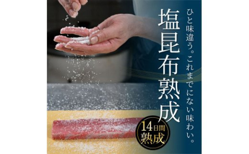 塩熟成することで適度に水分が抜けマグロの旨味を凝縮し柔らかく、昆布を巻くことでその風味が味を各段に引き上げます。