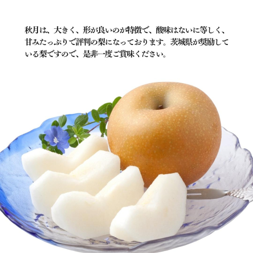 秋月は、大きく、形が良いのが特徴で、酸味はないに等しく、甘みたっぷりで評判の梨になっております。茨城県が奨励している梨ですので、是非一度ご賞味ください。