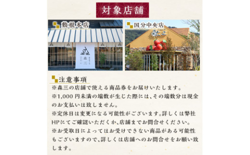 森三の霧島市内2店舗でのイートインのみでご利用いただける商品券です。霧島市にお越しの際にぜひご利用ください。 創作かるかん島津公などの和菓子から、季節ごとにかわるケーキなど、地元の素材をふんだんに使用した和洋菓子をご準備しております。 和モダンな雰囲気の敷根本店 限定販売の「あぶり餅」も人気です! 皆さまのお越しを心よりお待ちしております。 ●森三 国分中央店(定休日:不定休)  営業時間:9:30~19:00  電話番号:0995-47-7000 ●森三 敷根本店(定休日:火曜)  営業時間:10:00~18:00  電話番号:0995-45-0485 《注意事項》 ※1,000円未満の端数が生じた際には、その端数分は現金のお支払いは致しません。 ※定休日は変更になる可能性がございます。詳しくは弊社HPにてご確認いただくか、店舗までお問合せください。 ※画像はイメージです(季節によって使用するフルーツ等が異なります。) ※お受取日によってはお受けできない商品がある可能性もございますので、詳しくは店舗へのお問合せをお願い致します。 《地産理由》 市内に所在する菓子店において、店内での食事において利用できる商品券 有限会社 森三 フリーダイヤル:0120-489-122