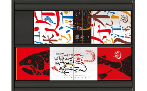 関西風の腹開き・地焼きにした鰻の蒲焼を山椒の有馬煮の香り とともに関西寿しにしました。そして琵琶湖の至宝「ビワマス」を伝統的な製法で〆た最高級ますの棒寿しは、寿しに最も適した希少な近江米「日本晴」を100%使用したシャリの中に玉葱の甘酢漬けや干瓢・椎茸などの佃煮を忍ばせ、しっとりと上品な旨味が持ち味。素材の鮮度を保った冷凍寿しは、自然解凍するだけで職人の技をご自宅でも再現していただけます。