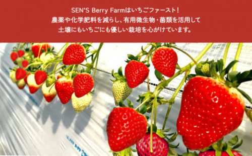 いちごファースト! 農薬や化学肥料を減らし、有用微生物・菌類を活用して土壌にもいちごにも優しい栽培を心がけています。