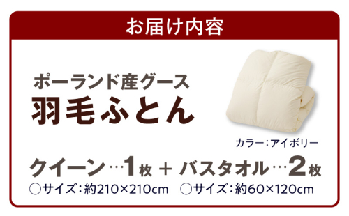 羽毛布団 1枚 ポーランド産グース贅沢仕様 クイーン 210cm×210cm アイボリー/バスタオル 2枚【国産 羽毛 ふとん 寝具 掛け布団 羽毛ふとん】 099H3102