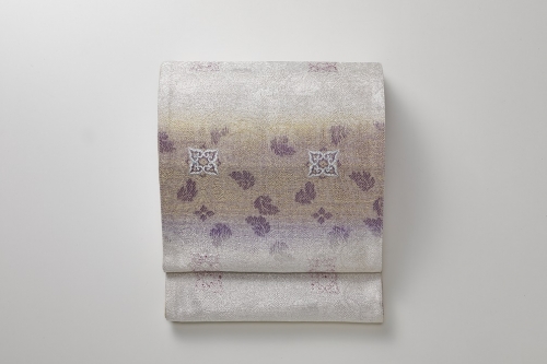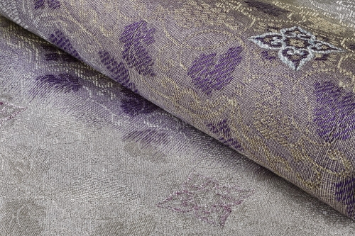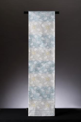 一本の糸の中に輝く箔の部分、色が強調される部分と両方の色を持った、その特色ある糸により、織られた作品は、複雑な色合いを持ち、また光によってより一層の色彩は輝きを放ちます。今回は「花喰鳥葡萄唐草文」・「葡萄唐草二釜文」の2柄を4配色にて制作いたしました。また、裏面も同素材にて金銀段ぼかし織となっているため、両面表(リバーシブル)としてご愛用いただけます。