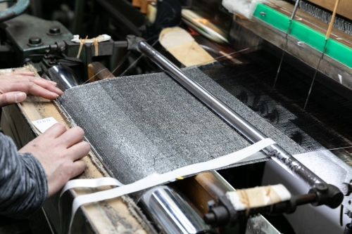 伊勢の神鎮まる聖地からの稀有な資源と、特色のある技術から生まれた作品は真綿の糸を御山杉の植物染料にてこだわりの色に染め上げ、金色、銀色など様々なに輝く箔を巻き付けて、帯の織り糸「ねん金糸」を制作します。
