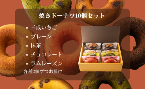 焼きドーナツ10個セット:三成いちご×2・プレーン×2・抹茶×2・チョコレート×2・ラムレーズン×2