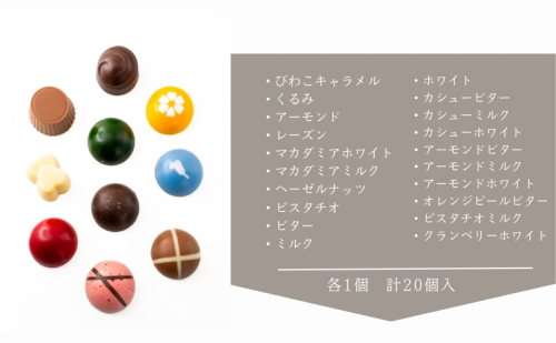 内容:びわこキャラメル・くるみ・アーモンド・レーズン・マカダミアホワイト・マカダミアミルク・ヘーゼルナッツ・ピスタチオ・ビター・ミルク・ホワイト・カシュービター・カシューミルク・カシューホワイト・アーモンドビター・アーモンドミルク・アーモンドホワイト・オレンジピールビター・ピスタチオミルク・クランベリーホワイト 各1個計20個