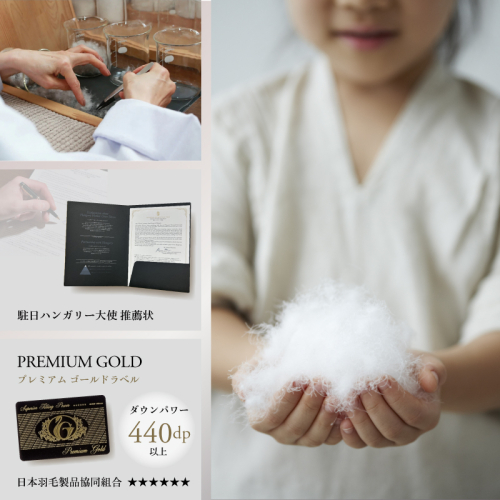 ダウンパワー440dp以上、日本羽毛製品協同組合発行の「プレミアムゴールドラベル」付き。