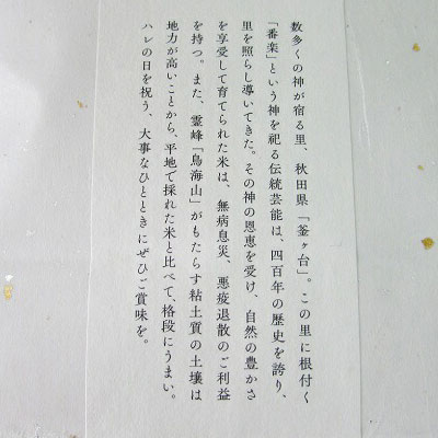 数多くの神が宿る里、秋田県「釜ヶ台(かまがたい)」。この里に根付く「番楽」という神を祀る伝統芸能は、四百年の歴史を誇り、郷を照らし導いてきました。その神の恩恵を受け、自然の豊かさを享受して栽培されたお米は、無病息災、悪疫退散のご利益を持つとされています。ハレの日を祝う、大事なひとときにぜひご賞味を。