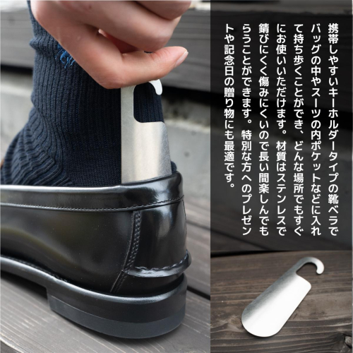 携帯しやすいキーホルダータイプの靴ベラでバッグの中やスーツの内ポケットなどに入れて持ち歩くことができ、どんな場所でもすぐにお使いいただけます。