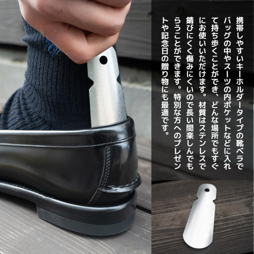 携帯しやすいキーホルダータイプの靴ベラでバッグの中やスーツの内ポケットなどに入れて持ち歩くことができ、どんな場所でもすぐにお使いいただけます。