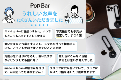 スタンド・グリップ・スティックの3つの機能を一挙に搭載させた、国内・米国で特許取得したスマホアクセサリーです。
