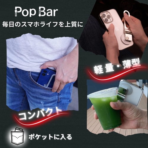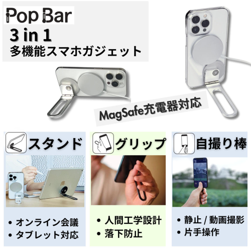 - BG062 Pop Bar <吟醸シルバー> 3in1 スマホ スタンド × グリップ × スティック 【 MagSafe対応 自撮り棒 360°回転 軽量 スリム 卓上 iPhone Android iPad タブレット マルチスタンド 】