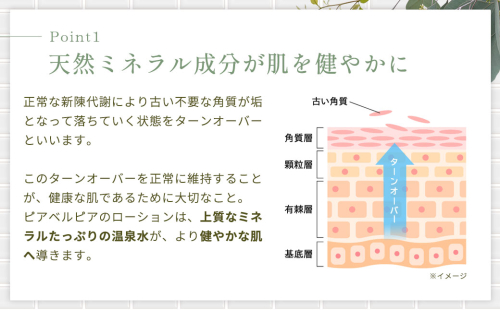 天然保湿因子を含む温泉水の他、保水力の高い「水溶性プロテオグリカン」やセラミド(スフィンゴ糖脂質)などを配合。