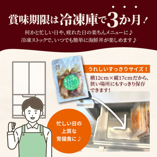 解凍するだけでお気軽に海鮮漬け丼が楽しめます。