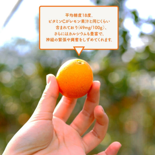 延岡市北方町の里山で、田口ファミリーファームが育てた完熟のきんかん。 温室ハウスで特別な栽培をしたきんかんは、平均糖度18度! 生のまま、皮ごと丸かじりできます。 皮の近くが甘く、栄養価も高いため、ぜひ、そのままお召し上がりください。 きんかんはビタミンCがレモン果汁と同じくらい含まれています。(49mg/100g)(五訂より) また、カルシウムも豊富で、神経の緊張や興奮をしずめてくれる果実です。 【地場産品基準】 1号:市内の事業者が市内で生産したきんかんであるため