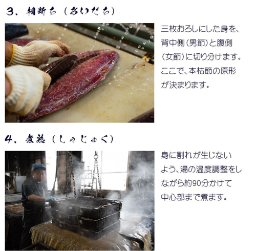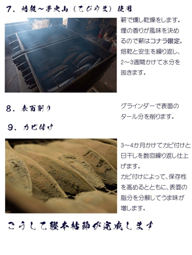 【説明】なんといっても鰹節は削りたてが一番。日本で伝統的に伝わる鰹本節(仕上節)は、ご家庭で削るために作られた鰹節です。完成まで数ヵ月、じっくりと手間と時間をかけて仕上げます。カビ付け工程を経て完成されたかつお節は、表面に凸凹がなく、まさに食の芸術品です。見た目も美しく、風味豊かな鰹節は食卓をグレードアップします。鰹本節は日本全国で焼津型が標準となっていますが、焼津で鰹本節を製造する工場はほんのわずかです。焼津産鰹本節は、限られた数量しか製造しておりません。