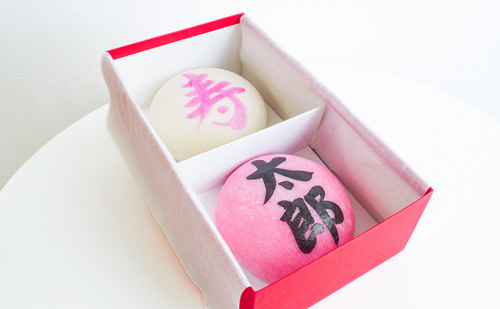 白餅に「寿」、紅餅に「お子様のお名前」を入れてお届けします。背負い袋は、小さなお子様が背負われたときにバランスがとりやすいように、前側(赤色)に紅餅、後ろ側(白色)に白餅が入るポケットをそれぞれご用意しております。ぜひ写真撮影もお楽しみください。
