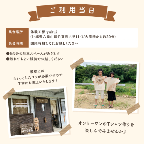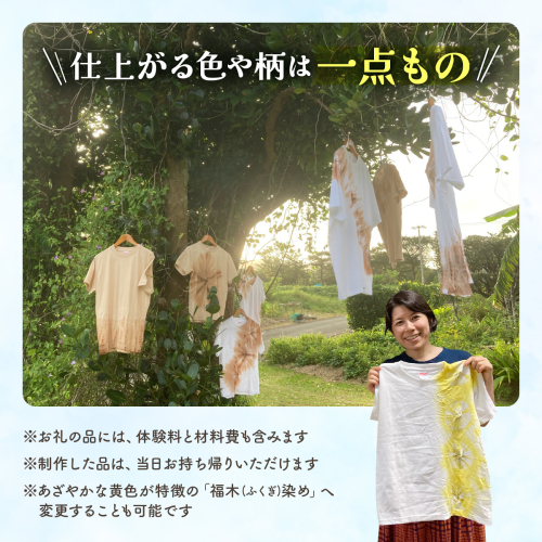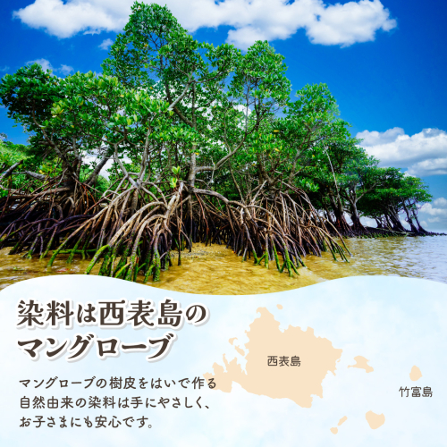 西表島の染め織り屋「体験工房yukui(ゆくい)」。島のマングローブを染料にした、Tシャツの染め体験コースです。 絞りの部分染めを体験いただきます。マングローブの力強くも柔らかい、茶色のグラデーションが浮かび上がります。仕上がる色や柄はまさに一点もの。 マングローブの樹皮をはいで作る自然由来の染料は手にやさしく、お子さまにも安心です。 前良川と後良川のあいだに位置する古見(こみ)集落。静かでゆったりとした時間が流れます、ぜひお越しください。 ※お礼の品には、体験料と材料費も含みます ※制作した品は、当日お持ち帰りいただけます ※あざやかな黄色が特徴の「福木(ふくぎ)染め」へ変更することも可能です ⚫︎この返礼品は令和5年度の竹富町特産品として認定されています。