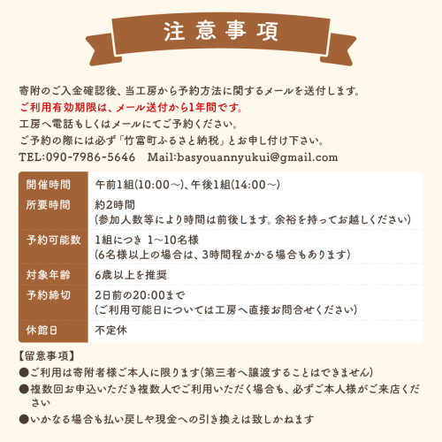 工房へ電話もしくはメールにてご予約ください。ご予約の際には必ず「竹富町ふるさと納税」とお申し付け下さい。