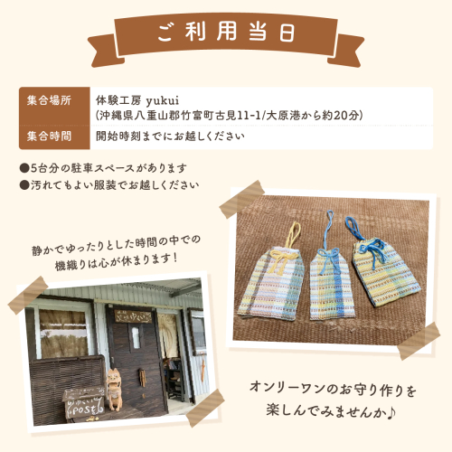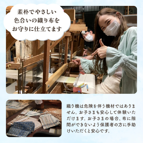 1名様の機織り体験、お守り1つ、約2時間