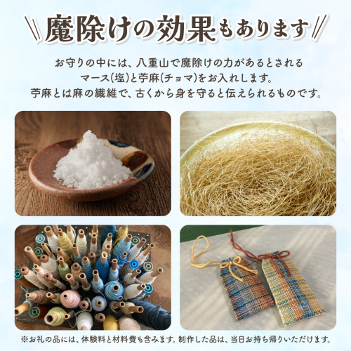 お守りの中には、八重山で魔除けの力があるとされるマース(塩)と苧麻(チョマ)をお入れします。苧麻(チョマ)とは麻の繊維で、古くから身を守ると伝えられるもの。