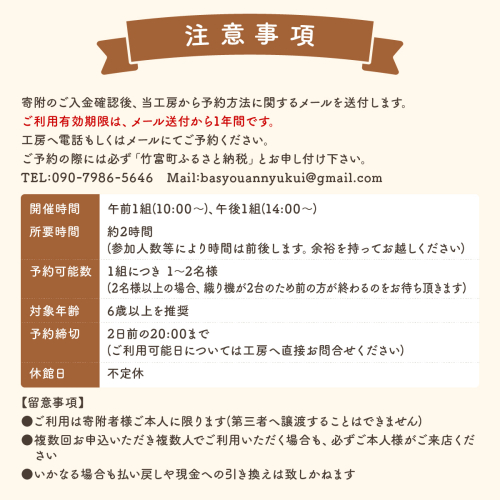 ◎予約可能数:一組につき1?2名様(2名様以上の場合、織り機が2台のため前の方が終わるのをお待ち頂きます)