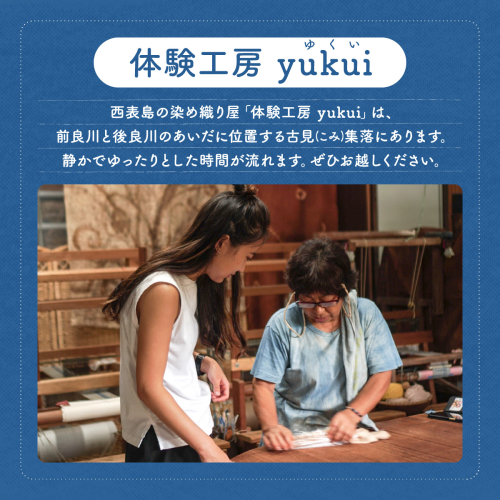西表島の染め織り屋「体験工房yukui(ゆくい)」。島の草木で染めた糸を使った、機織り体験コースです。素朴でやさしい色合いの織り布を、お守りに仕立てます。